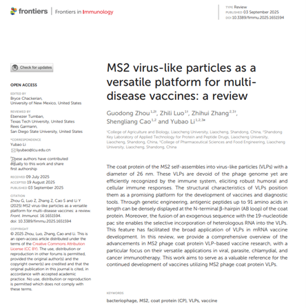 2025年9月3号,聊城大学噬菌体研究中心研究团队在国际免疫学期刊《Frontiers in Immunology》(中科院二区,IF=5.9)上发表了一篇系统综述,详细阐述了MS2噬菌体病毒样颗粒(Virus-like Particles, VLPs)作为一种高度灵活、安全高效的疫苗平台,在应对病毒、细菌、寄生虫乃至癌症等多种疾病方面的广阔应用前景。该研究不仅总结了MS2 VLP平台的技术优势与最新进展,也为未来疫苗的快速开发与部署提供了新的思路。