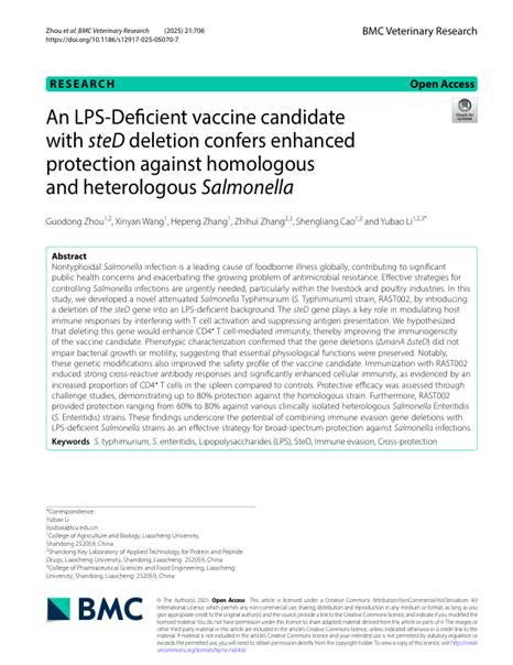 2025年12月15日,聊城大学噬菌体研究中心研究团队在国际兽医学期刊《BMC Veterinary Research》(中科院二区,IF=2.6)上发表了一项沙门菌疫苗研究论文。该研究成功构建了一株具有脂多糖(LPS)缺陷及免疫逃逸基因缺失的双重减毒沙门菌疫苗候选株RAST002,该菌株在动物模型中展现出了对同源及异源沙门菌血清型的优异交叉保护效果,为开发高效、广谱的沙门菌活疫苗提供了全新策略。