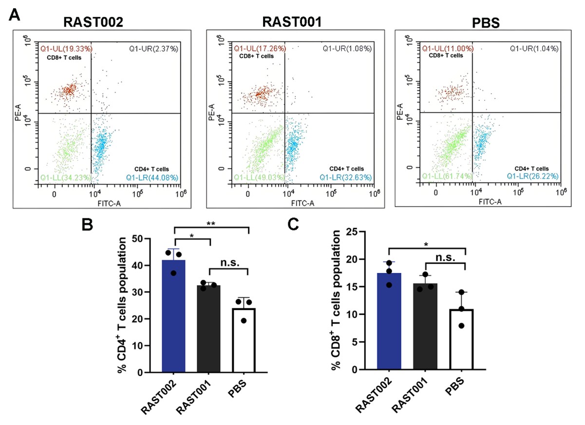 研究构建的疫苗候选株RAST002(ΔmanA ΔsteD)具有两大关键特征。其一,结构减毒且安全性高:manA 基因的缺失导致LPS合成缺陷,显著降低了细菌毒力;表型分析证实该突变不影响细菌基本生长与运动能力,确保了疫苗株的稳定性。动物实验显示其口服半数致死剂量(LD₅₀)超过1×10⁹ CFU,具备极高的安全性。其二,靶向解除免疫抑制:steD 基因编码的效应蛋白可通过下调抗原提呈相关分子来干扰宿主CD4⁺ T细胞活化,删除该基因旨在“解锁”宿主的适应性免疫应答,增强细胞免疫。