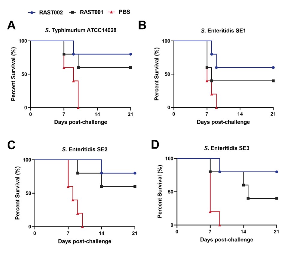 在攻毒保护实验中,RAST002展现了卓越的保护效力:对同源鼠伤寒沙门氏菌(S. Typhimurium)的攻击保护率高达80%;对三种临床分离的异源肠炎沙门菌毒株的攻击,保护率也达到60%-80%。同时,免疫小鼠在攻毒后脾脏、肝脏及肠道内的细菌载量显著降低,证实了其有效的清除病原能力。